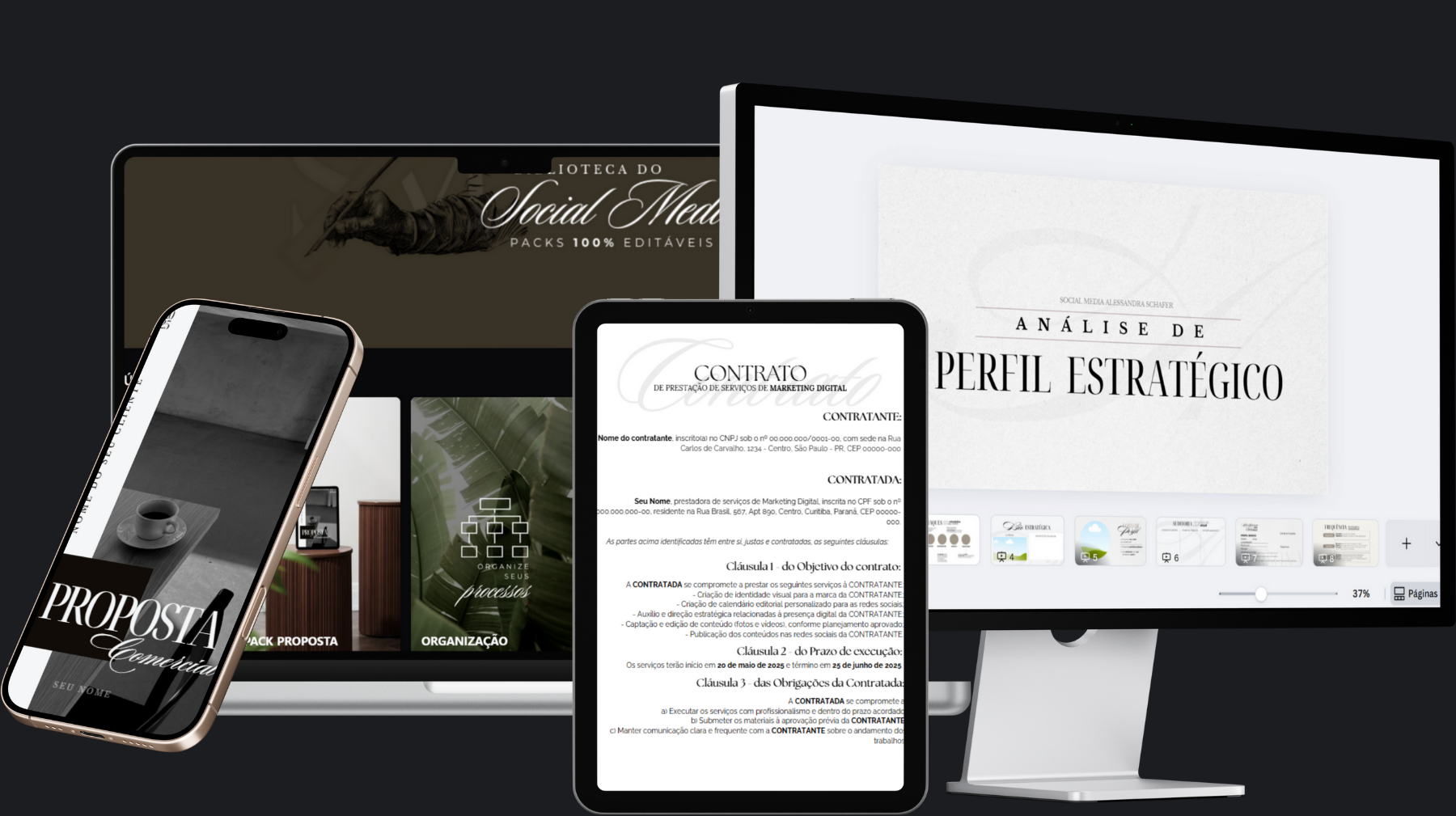Modelos 100% editáveis de contratos, propostas, briefings, calendários e muito mais.